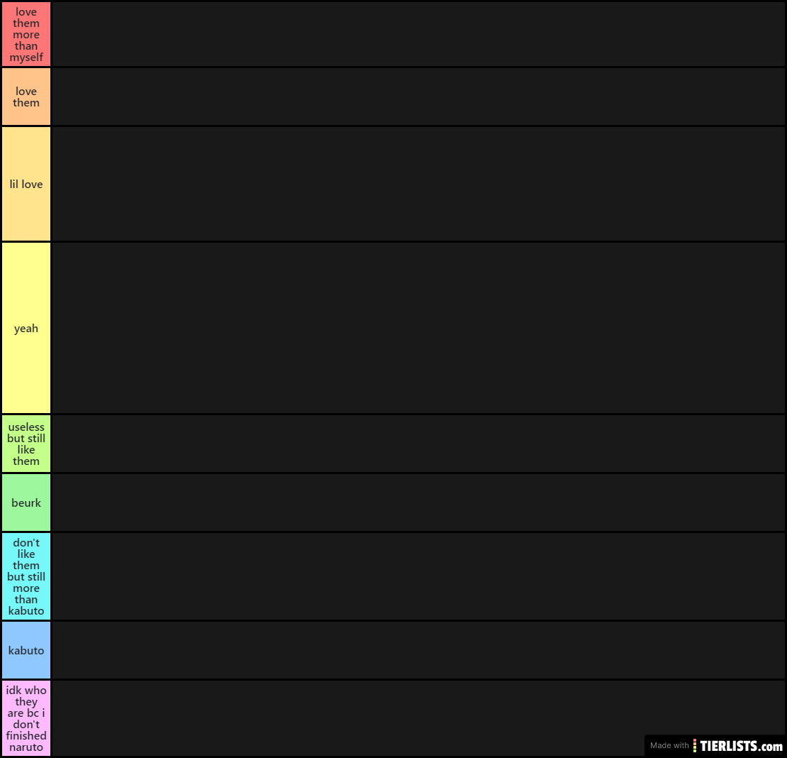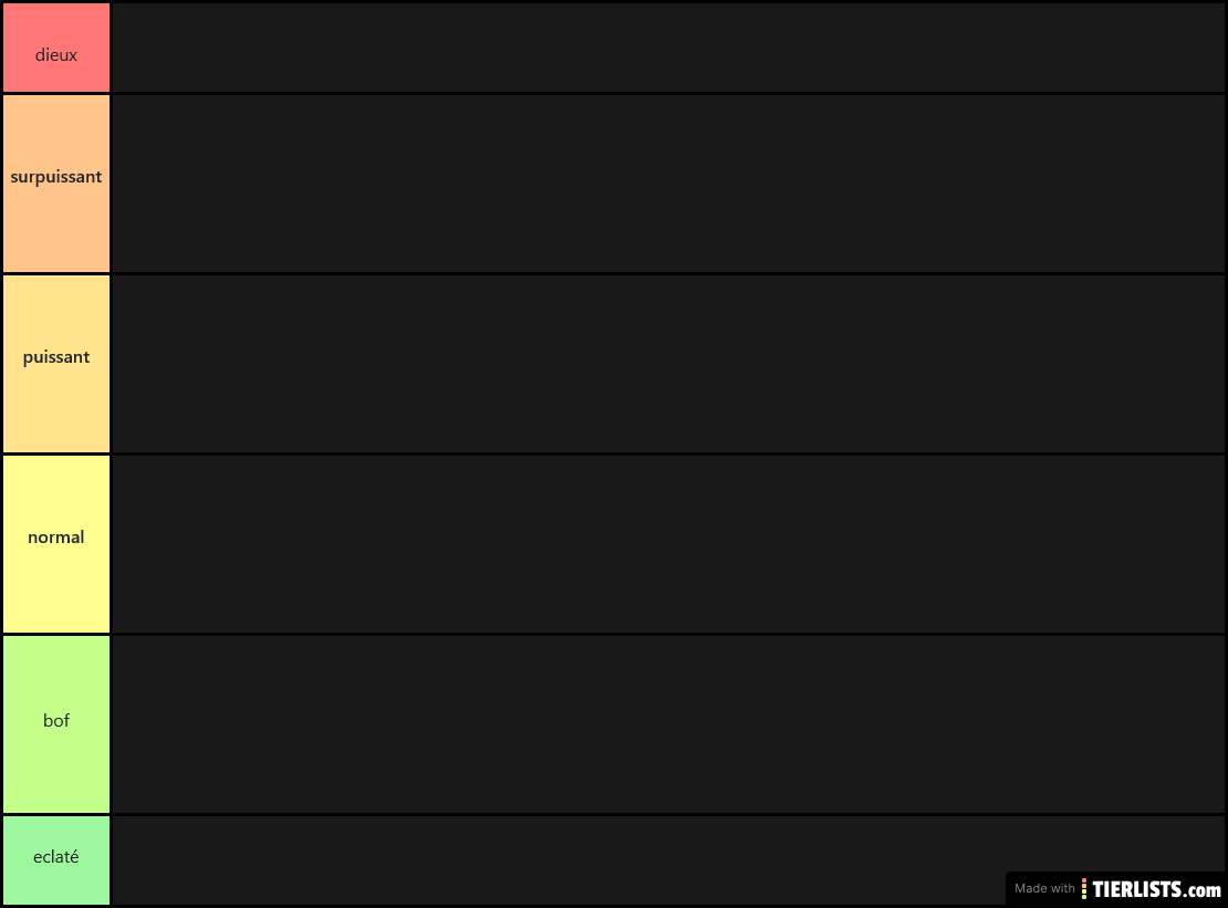 Press the labels to change the label text. Drag and drop items from the bottom and put them on your desired tier. Modify tier labels, colors or position through the action bar on the right.
