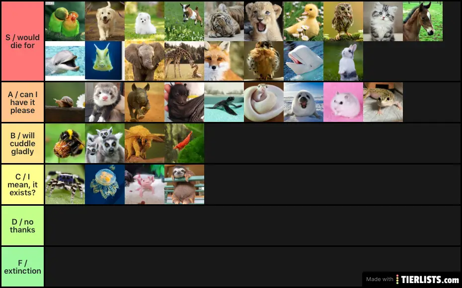 Press the labels to change the label text. Drag and drop items from the bottom and put them on your desired tier. Modify tier labels, colors or position through the action bar on the right.