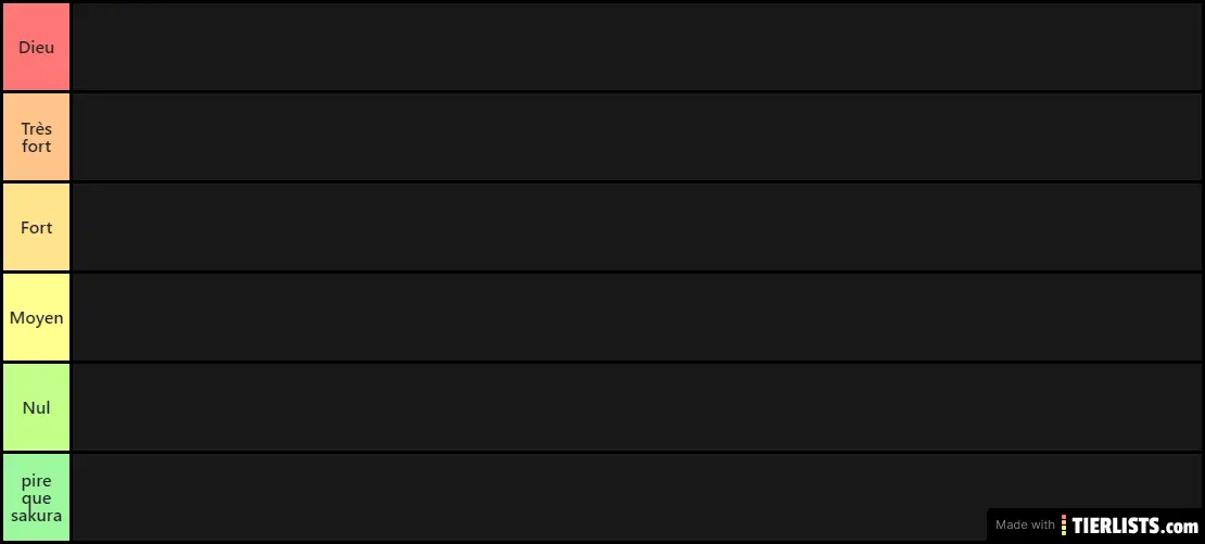 Press the labels to change the label text. Drag and drop items from the bottom and put them on your desired tier. Modify tier labels, colors or position through the action bar on the right.