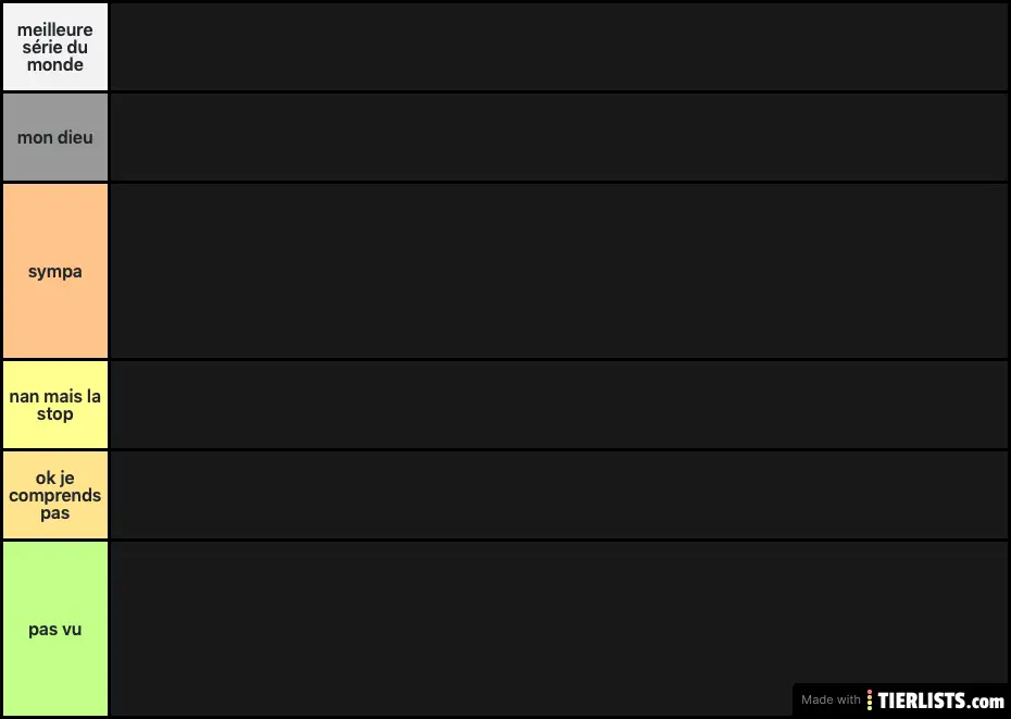Press the labels to change the label text. Drag and drop items from the bottom and put them on your desired tier. Modify tier labels, colors or position through the action bar on the right.